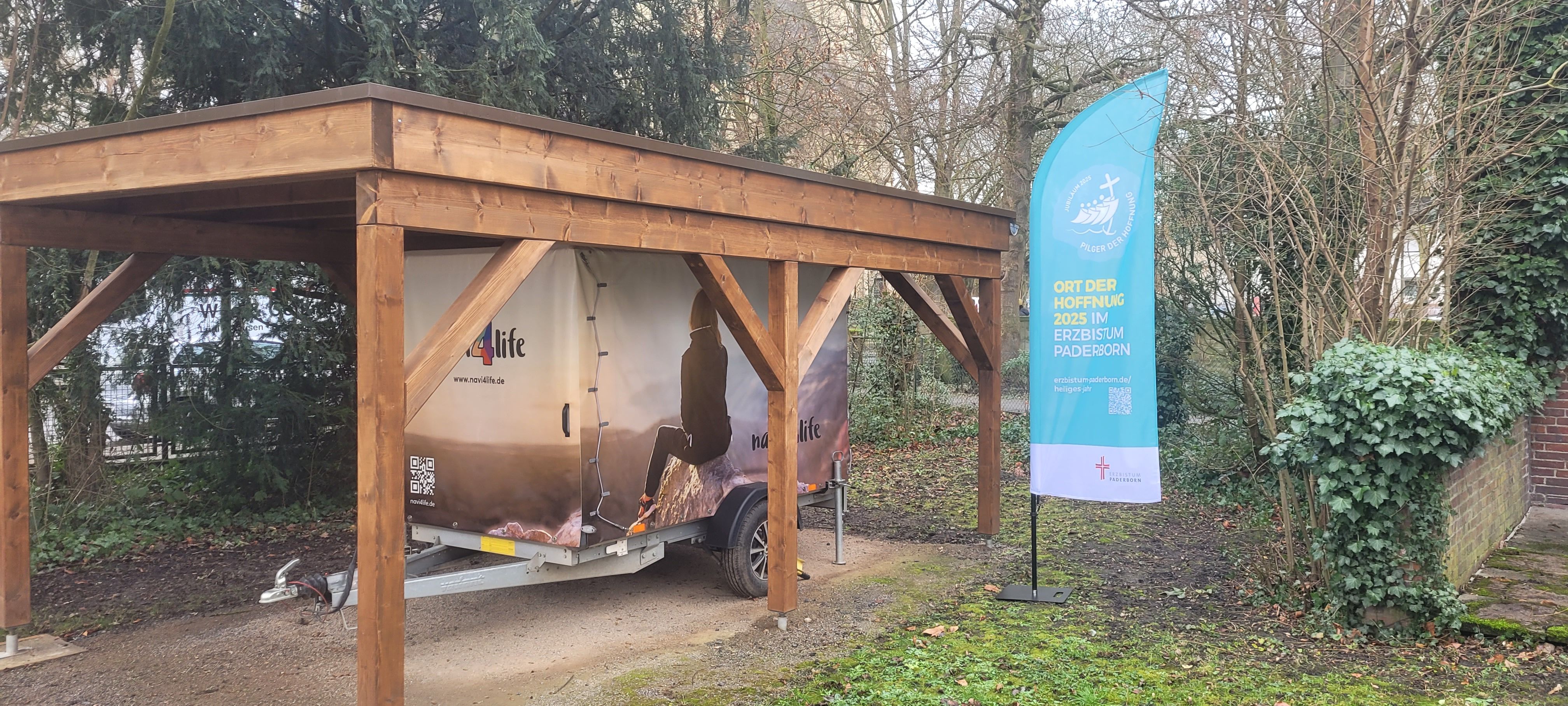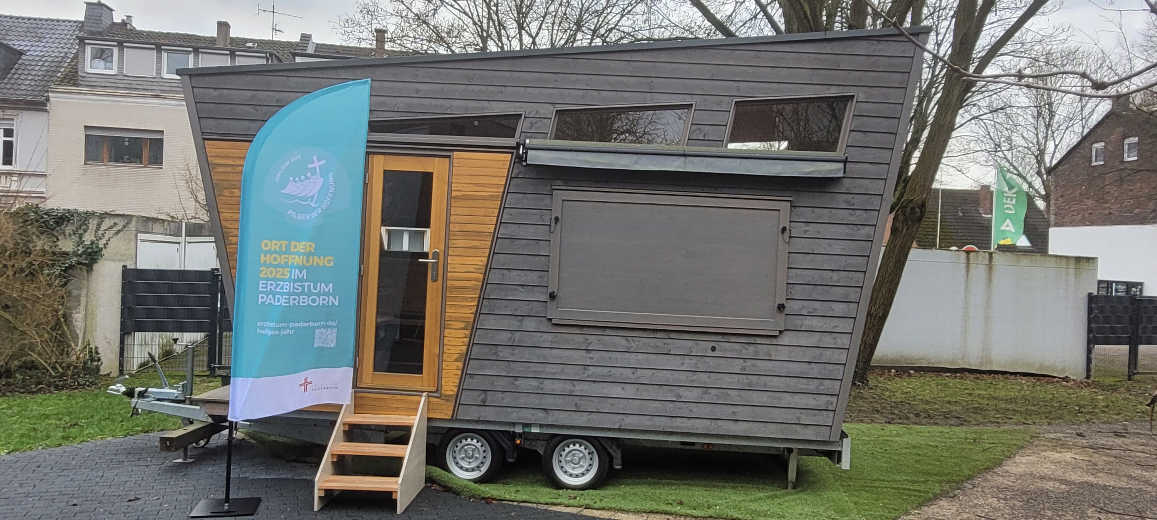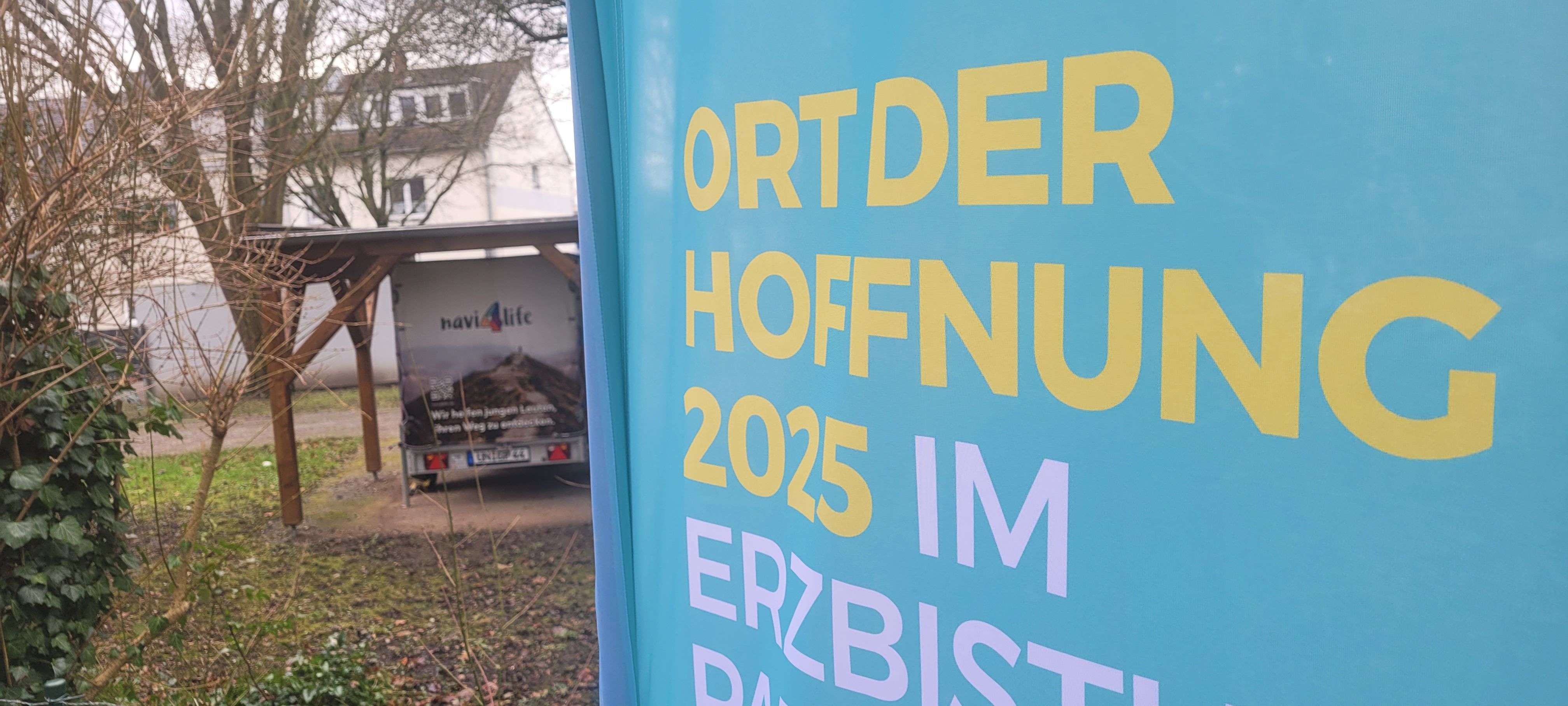 Gern habe ich eingewilligt, bei der Eröffnung des Jubeljahres 2025 im Dom zu Paderborn eine Hoffnungsflagge aus den Händen des Erzbischofs zu übernehmen. Als wir abends wieder zurück in Kamen waren, hab ich versucht, die Flagge aufzubauen. Sie ist so lang, dass sie bei uns im Pfarrhaus nur in das Treppenhaus passt. Aber vor dem Tiny House, vor dem Tiny Mobil und vor dem Zelt in der Kirche steht sie hervorragend. Während ich die beachflag dorthin stellte, kamen mir viele Gesichter junger Menschen in Erinnerung, denen wir im vergangenen Jahr mit navi4life begegnet sind, über 2000 junge Leute haben wir erreicht. So geht’s für uns weiter – als Pilger*innen der Hoffnung.