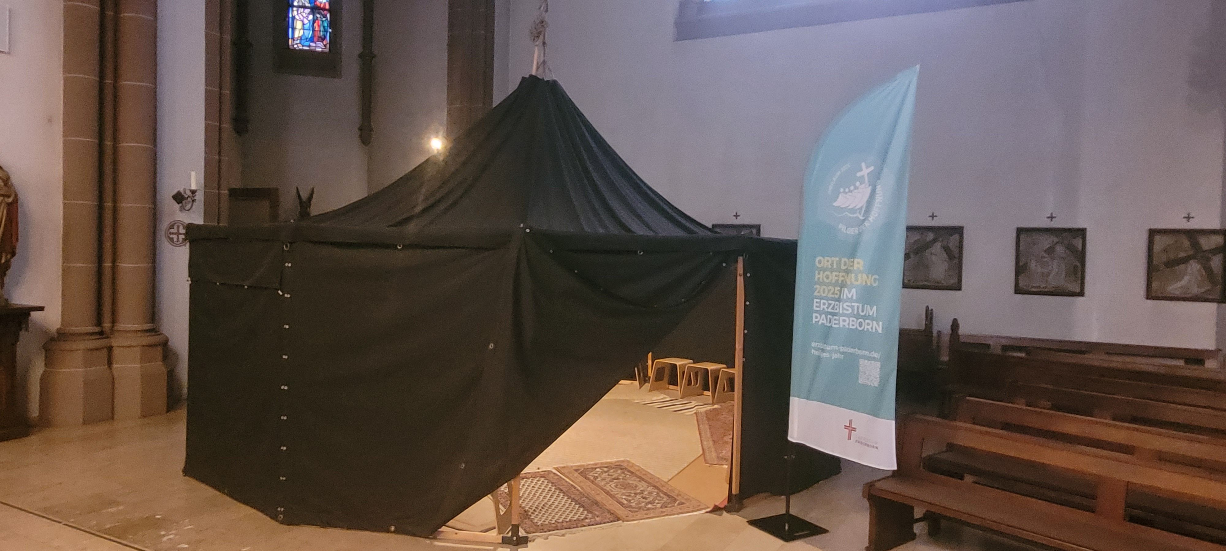 Bald schon wird die Flagge dabei sein, wenn wir an der BVB-Gründerkirche in Dortmund einen Friedensmahner errichten, sie wird uns begleiten, wenn wir an Schulen und in Jugend- und Firmgruppen unsere Module den jungen Menschen anbieten, sie wird auf Libori mit uns am Dom-Turm stehen, sie wird einfach dort sein, wo uns das Leben dieses Jahr hinbringen wird und sie wird für den verborgenen Gott stehen, der uns versprochen hat, auf all unseren Wegen mit dabei zu sein und selber die Hoffnung zu schenken, die nur er geben kann. Diese Erfahrung darf ich immer wieder bei den monatlichen Zeltgottesdiensten mit Jugendlichem im Zelt in der Kirche Heilige Familie Kamen machen. Auch dort wird die Fahne stehen, denn auch dieser Ort ist ein Ort der Hoffnung, wo wir den erleben, der „unter uns zelten“ möchte.