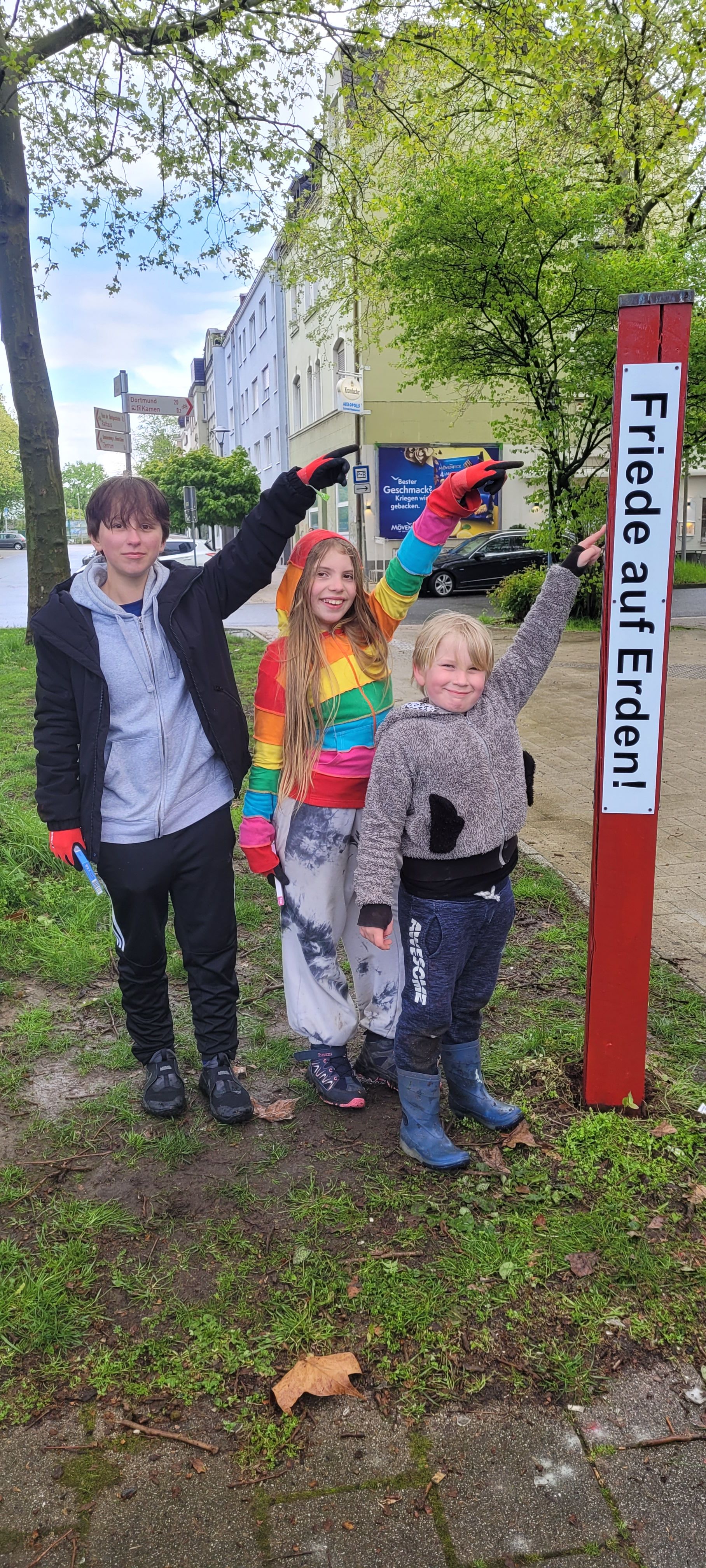 Unter dem Motto „FRIEDEN – DU machst den Unterschied!“ haben sich Jugendliche aus dem go4peace-Netzwerk in Kamen am vergangenen Wochenende an der 72-Stunden-Aktion des BDKJ beteiligt. Am Donnerstag-Abend trafen sie sich für eine Stunde in der Kirche Heilige Familie und erzählten an sechs verschiedenen Orten von ihren eigenen Glaubensgeschichten. Es waren sehr persönliche und bewegende Augenblicke. Am Freitag wurde – dem Regen zum trotz – wenn auch ein wenig verspätet, der Friedensmahner vor dem Rathaus renoviert. Als die Gruppe am frühen Abend um den Friedensmahner stand und für den Frieden in der Welt betete, sagte Lukas, mit sieben Jahren der jüngste Teilnehmer: „Ich wünsche mir, dass überall auf der Welt Menschen wieder Ruhe finden und genug zu essen haben!“ Am Samstag transportierten die jungen Friedensengagierten einen Friedensmahner nach Methler. In der Kirche St. Marien wurde er unter dem Beisein von über 100 Kindern und Eltern der KiTa St. Marien gesegnet. Zuvor brachte das Team der KiTa in einem Theaterspiel auf den Punkt: Stärke, Schönheit, Macht und Reichtum verhelfen oft weniger zum Frieden als ein frohes Herz. So erinnert der Friedensmahner, der anschließend vor der KiTa errichtet wurde, alle Vorbeigehenden daran, mit dem eigenen Herzen in Frieden zu leben, um selber Frieden stiften zu können. Kaffee, Waffeln und Kuchen rundeten dann die kleine Feier ab, zu der das Koordinationsteam des BDKJ Unna eigens angereist war. Am Sonntag wurde dann eine der Teilnehmer*innen – 14-jährig – getauft. Sie hatte sich das Lied „He’s got the whole world in his hands“ gewünscht. An der Atmosphäre während der Tage war zu spüren: Wir sind nicht allein unterwegs. Der verborgene Gott gesellt sich dort spürbar zu uns, wo wir dem Frieden eine Chance geben. – Danke all den Jugendlichen und Älteren, die diese besonderen Tage möglich gemacht haben.