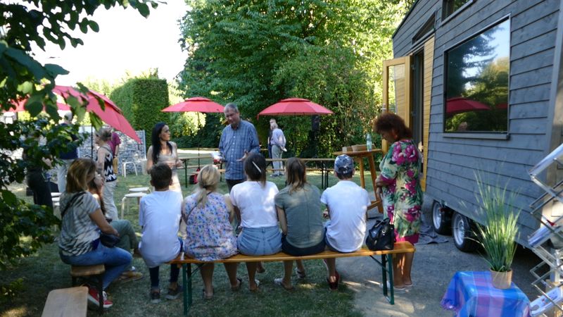 Über 100 Besucher*innen schauten am Samstag, dem 13.08., im Garten des Pfarrhauses in Kamen vorbei. Dort steht seit wenigen Tagen das navi4life-Mobil, ein Tiny House auf Rädern. Meinolf Wacker und Bernhard Nake, Initiatoren des Projektweges navi4life, erklärten den Besucher*innen, wie junge Leute auf diesem Weg stark gemacht werden für ihr eigenes Leben. Sie bekommen zu Beginn ein kleines lebenspraktisches Buch, „Mein Logbuch – Da ist Leben drin!“ und sind eingeladen, dieses Buch mit ihrem Handy in den Rucksack zu packen und an ihren Lieblingsort zu gehen, wo sie gern sind und sich wohl fühlen. In vier Kapiteln – unterstützt durch begleitende Tutorials (kleine Videofilme) in der Cloud, in denen junge Menschen ihre persönliche Erfahrung teilen – werden die Jugendlichen ermutigt, sich den Fragen, die das Leben aufwirft, zu stellen. Jeder bearbeitet das Logbuch für sich selbst und macht es dadurch zu seinem persönlichen Buch.