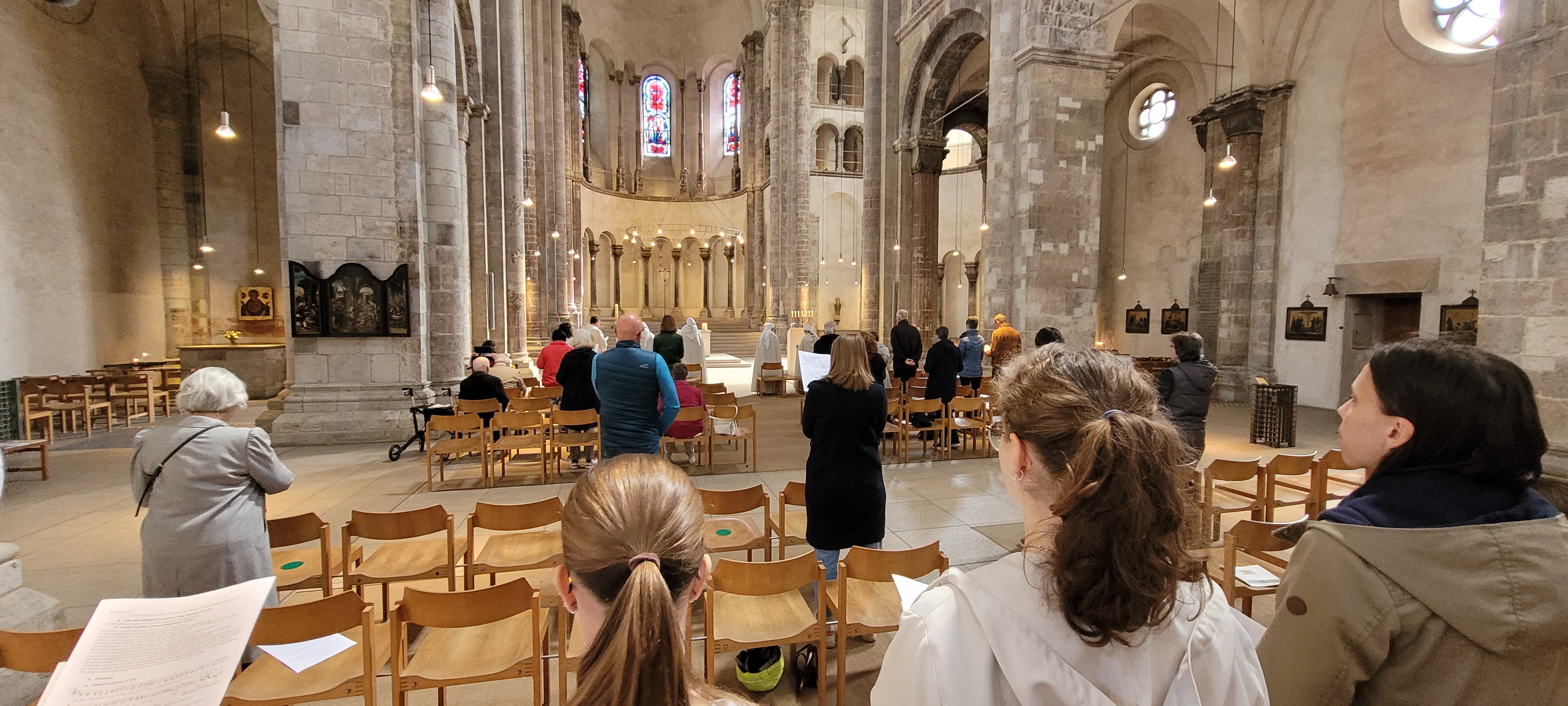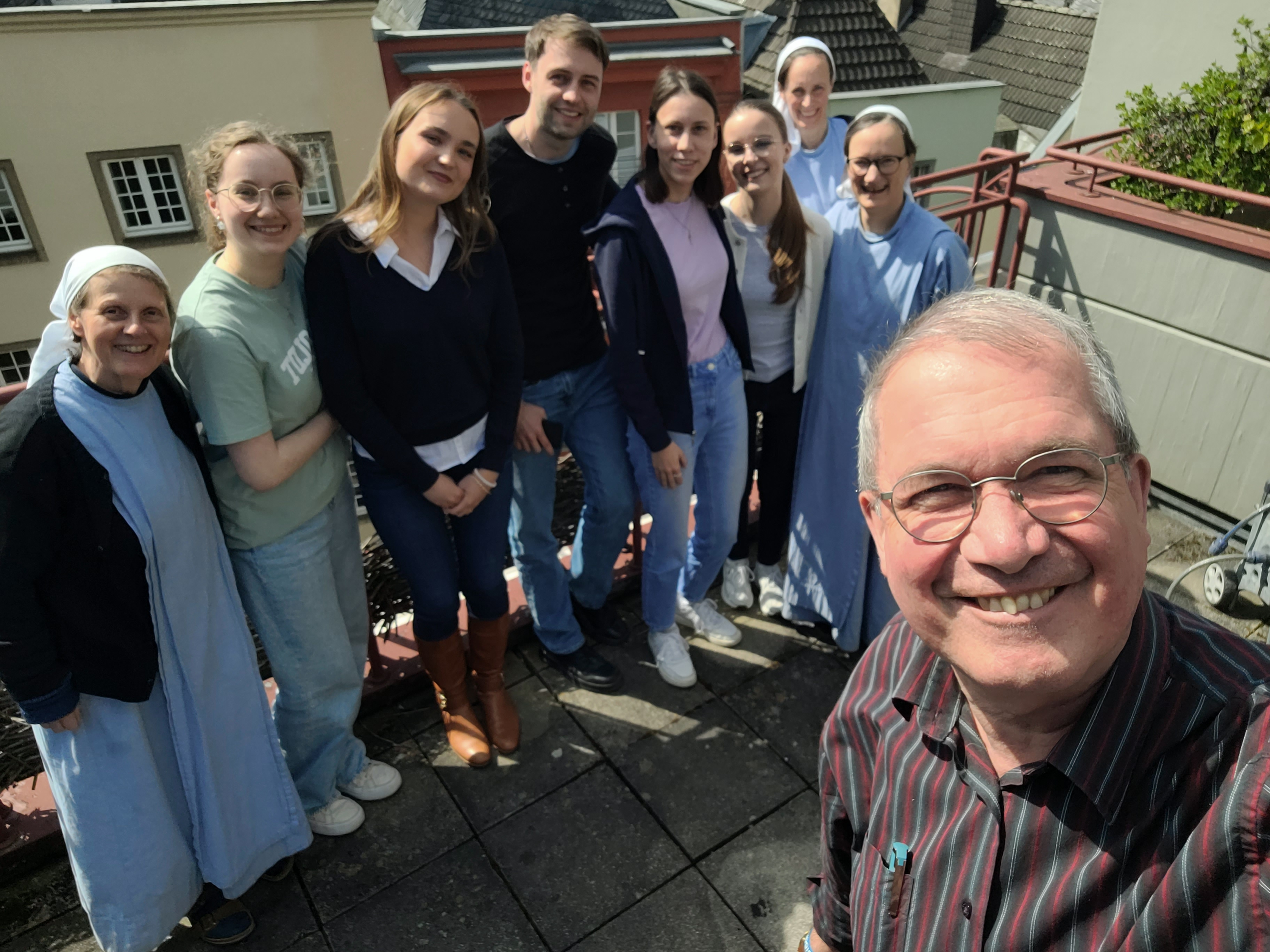 Sechs Pilger und Pilgerinnen auf dem Weg nach Jerusalem, nein nicht zu der alten biblischen Metropole in Israel, sondern zur Gemeinschaft „Jerusalem“ in Köln. Seit 17 Jahren leben dort fünf Schwestern in Groß Sankt Martin und halten – mitten in der Pary-Meile von Köln - in der alten romanischen Kirche das Geheimnis Gottes lebendig offen. Drei Mal am Tag treffen sie sich in der Kirche zum Stundengebet und abends zur Eucharistiefeier. Und immer schauen Menschen unterschiedlichster Couleur vorbei, um als Tourist die Schönheit der romanischen Kirche zu erleben, um einen kurzen Augenblick in der Stille dieser Kirche zu verweilen, um ein Gespräch zu suchen oder um an der Liturgie teilzunehmen.