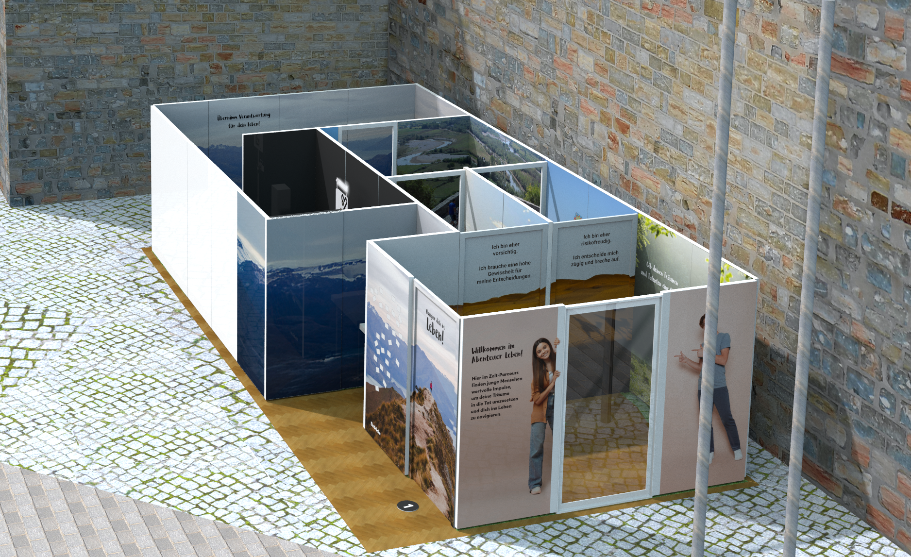 View of the navi4life "experience parcours": Several walk-in rooms with large wall images, quotations, and interactive stations invite visitors to explore the ‘adventure of life’. Each visitor is guided by an audio guide on this journey.