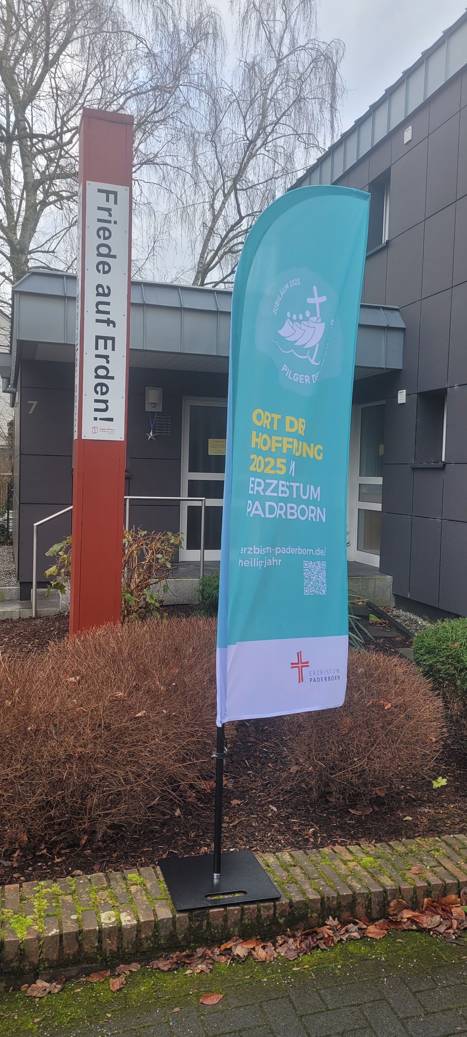 Gern habe ich eingewilligt, bei der Eröffnung des Jubeljahres 2025 im Dom zu Paderborn eine Hoffnungsflagge aus den Händen des Erzbischofs zu übernehmen. Als wir abends wieder zurück in Kamen waren, hab ich versucht, die Flagge aufzubauen. Sie ist so lang, dass sie bei uns im Pfarrhaus nur in das Treppenhaus passt. Aber vor dem Tiny House, vor dem Tiny Mobil und vor dem Zelt in der Kirche steht sie hervorragend. Während ich die beachflag dorthin stellte, kamen mir viele Gesichter junger Menschen in Erinnerung, denen wir im vergangenen Jahr mit navi4life begegnet sind, über 2000 junge Leute haben wir erreicht. So geht’s für uns weiter – als Pilger*innen der Hoffnung.