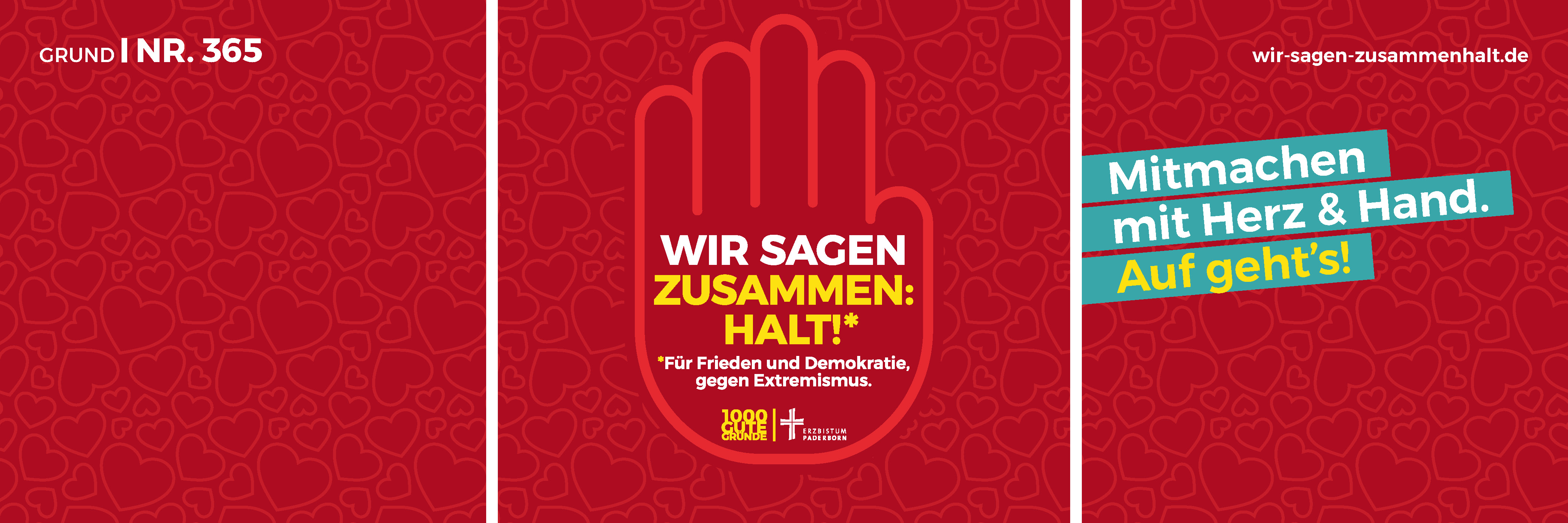 Wenn die Werte unseres Zusammenlebens wieder einmal einer Belastungsprobe unterzogen werden, ist es an der Zeit, den Zusammenhalt untereinander zu stärken. Mit der Mitmach-Kampagne „WIR SAGEN ZUSAMMEN: HALT!“ setzen wir im Erzbistum Paderborn sichtbare Zeichen für Frieden, Demokratie, Menschenwürde und Nächstenliebe – und sagen „Halt!“, um Diskriminierung, Ausgrenzung und Benachteiligung zu stoppen.