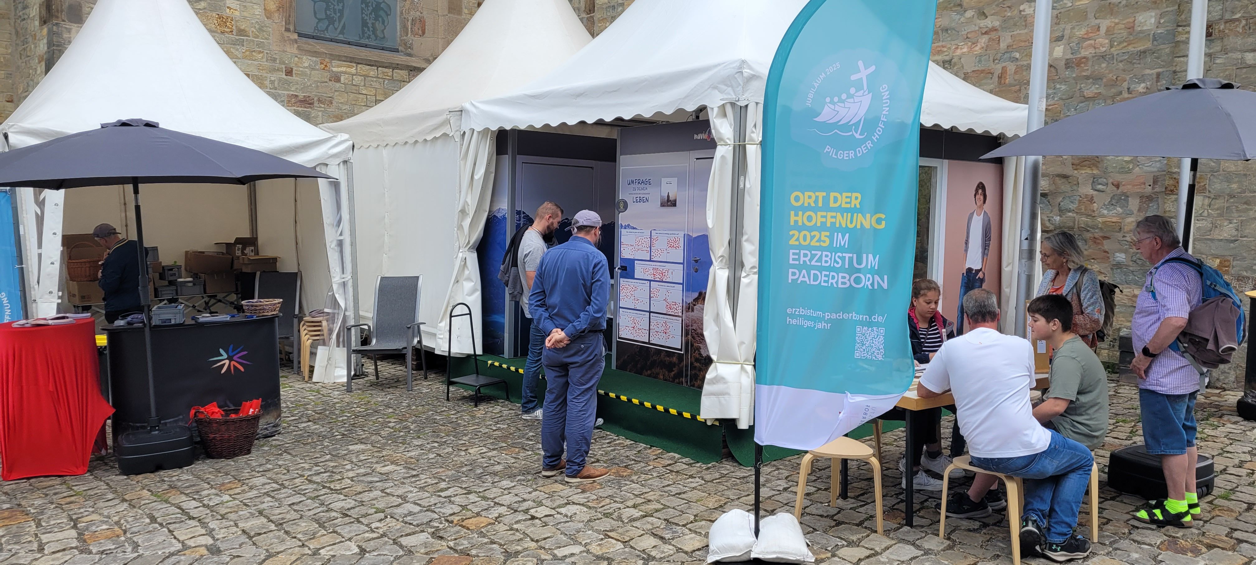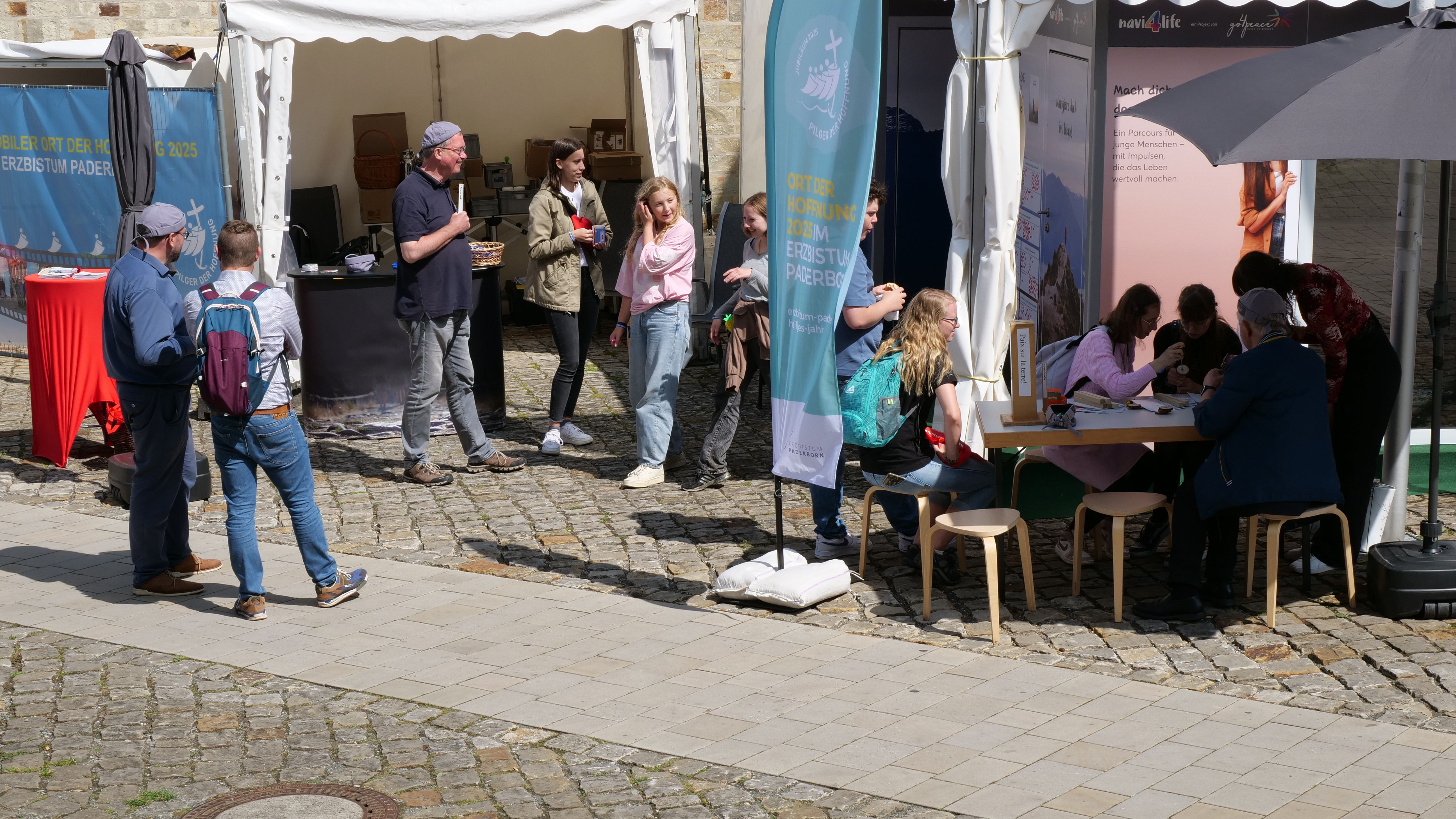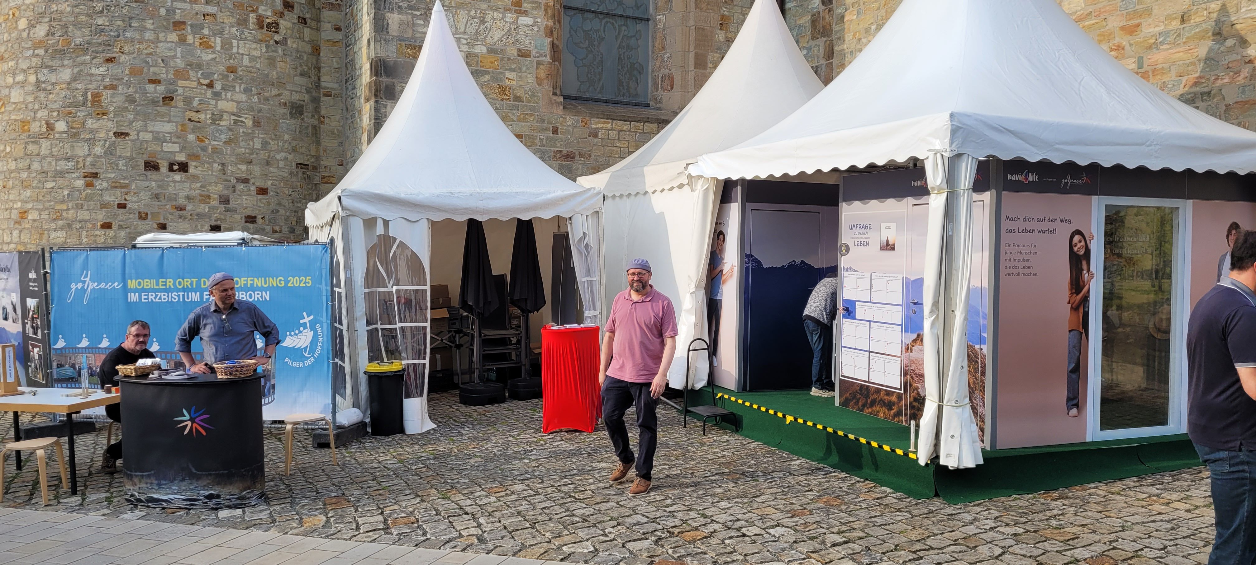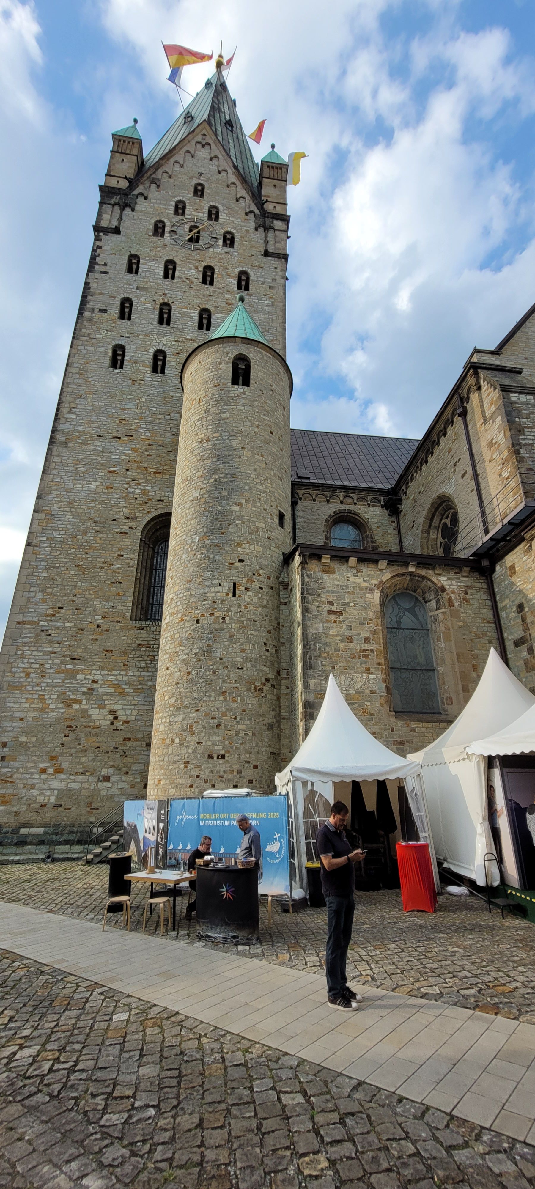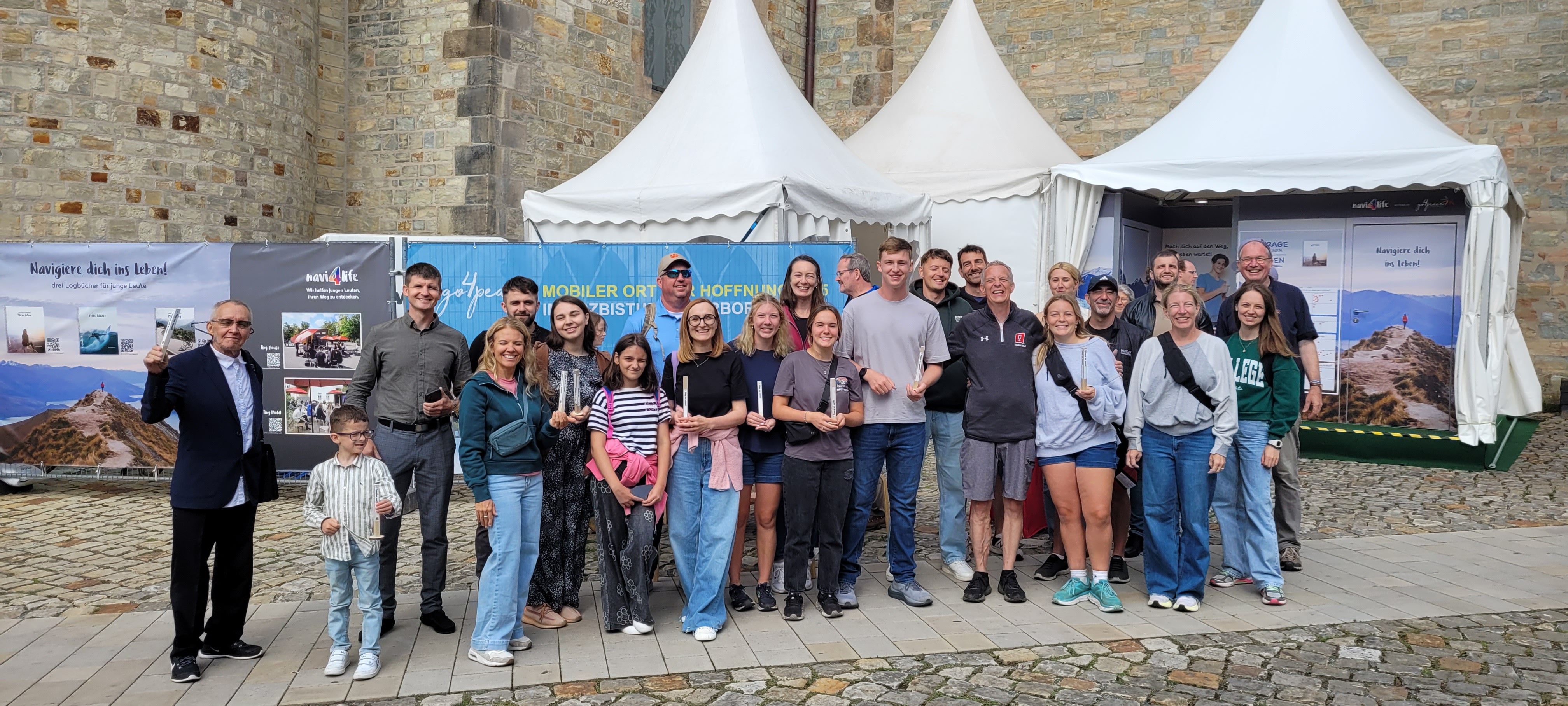 We were at the Cathedral Tower in Paderborn during the Libori festival (July 26 – August 3, 2025) with the experience course “navi4life – Navigate Yourself into Life!”. Archbishop Dr. Udo Markus Bentz smiled and said: “You are really standing in the wind here!” Yes, it is the windiest corner of the Cathedral – and many Libori pilgrims were “blown” past us. More than 180 young people, adults, and also children already walked the 10-minute course and were excited. A young woman said: “I found my way! – You really encouraged me. Keep going!” A priest added: “This is not only for young people – I also got new ideas for my life.” A superintendent said after walking through the four rooms with his wife: “You created a place here at the Libori festival where people can think about their own life. Impressive. Thank you!”