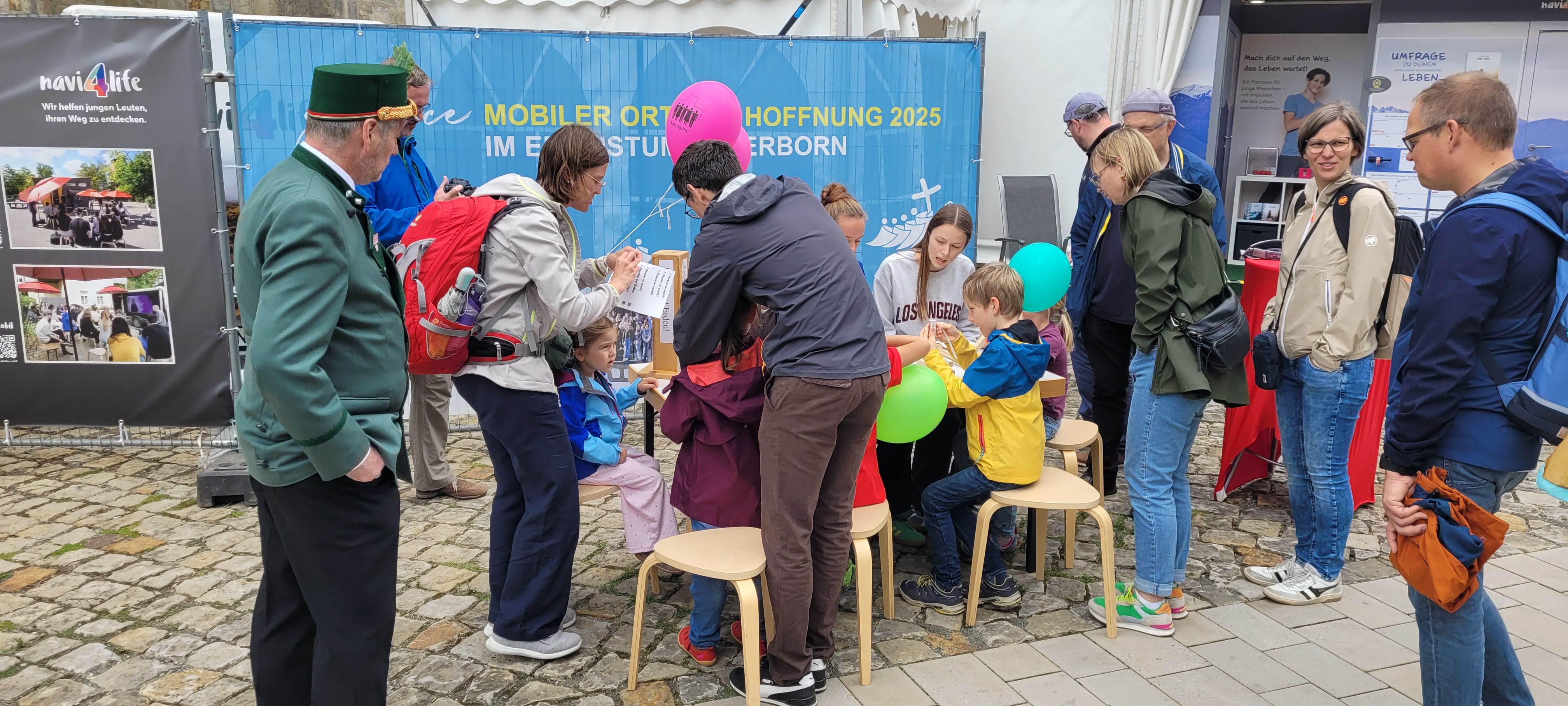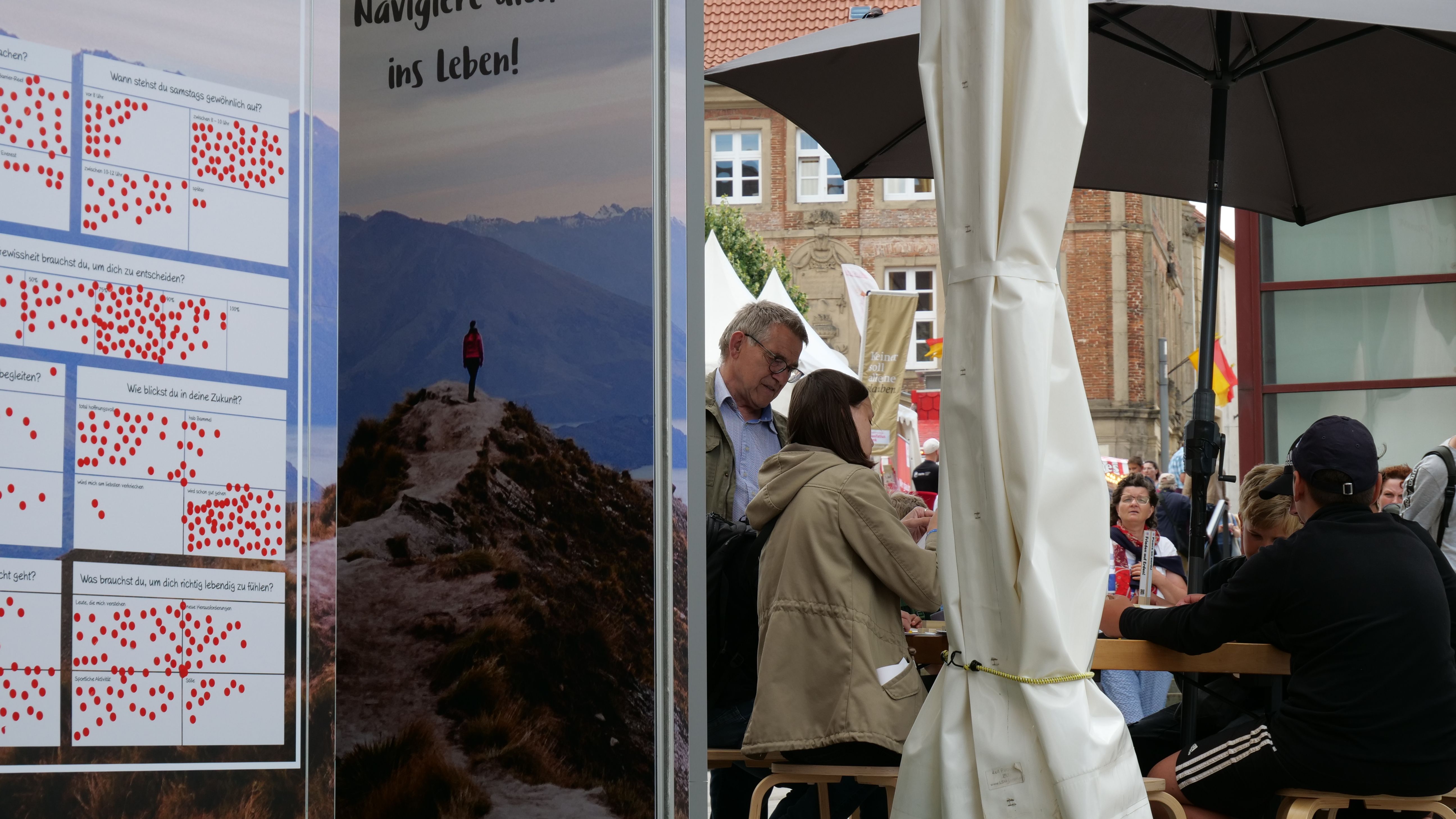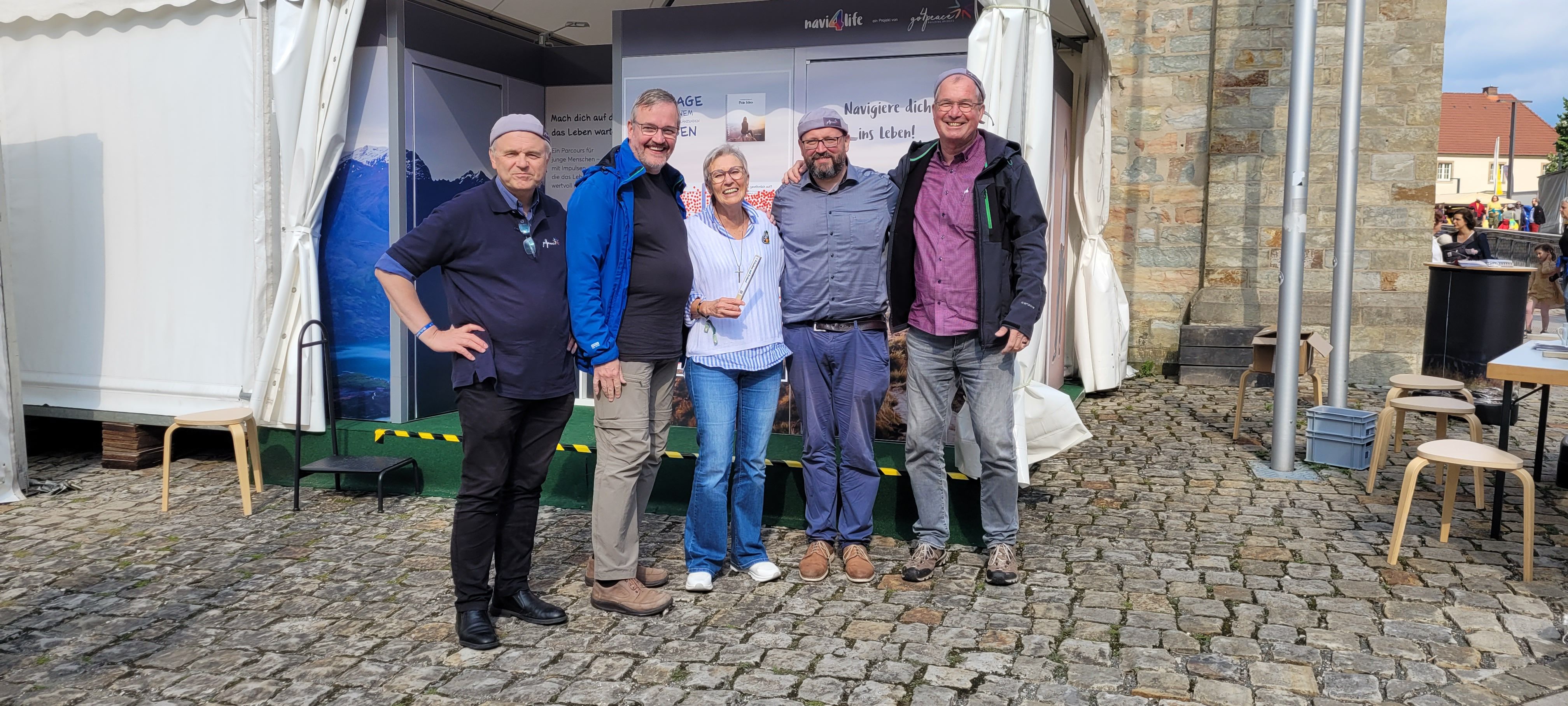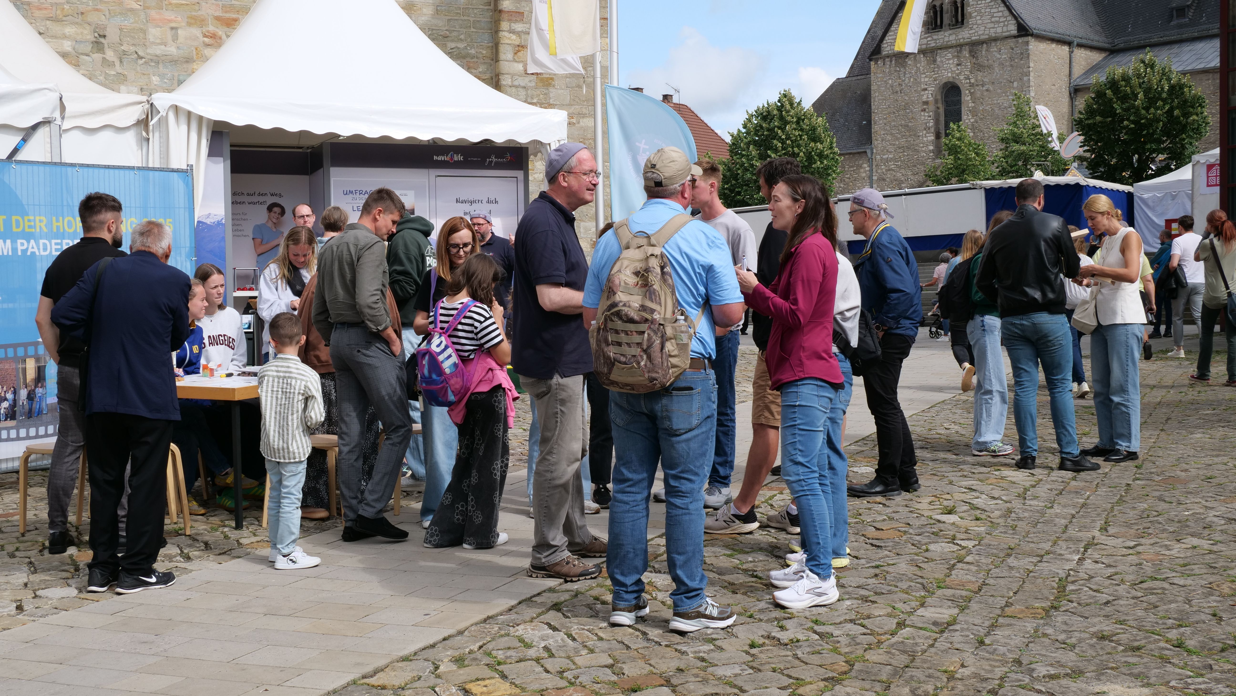 We were at the Cathedral Tower in Paderborn during the Libori festival (July 26 – August 3, 2025) with the experience course “navi4life – Navigate Yourself into Life!”. Archbishop Dr. Udo Markus Bentz smiled and said: “You are really standing in the wind here!” Yes, it is the windiest corner of the Cathedral – and many Libori pilgrims were “blown” past us. More than 180 young people, adults, and also children already walked the 10-minute course and were excited. A young woman said: “I found my way! – You really encouraged me. Keep going!” A priest added: “This is not only for young people – I also got new ideas for my life.” A superintendent said after walking through the four rooms with his wife: “You created a place here at the Libori festival where people can think about their own life. Impressive. Thank you!”