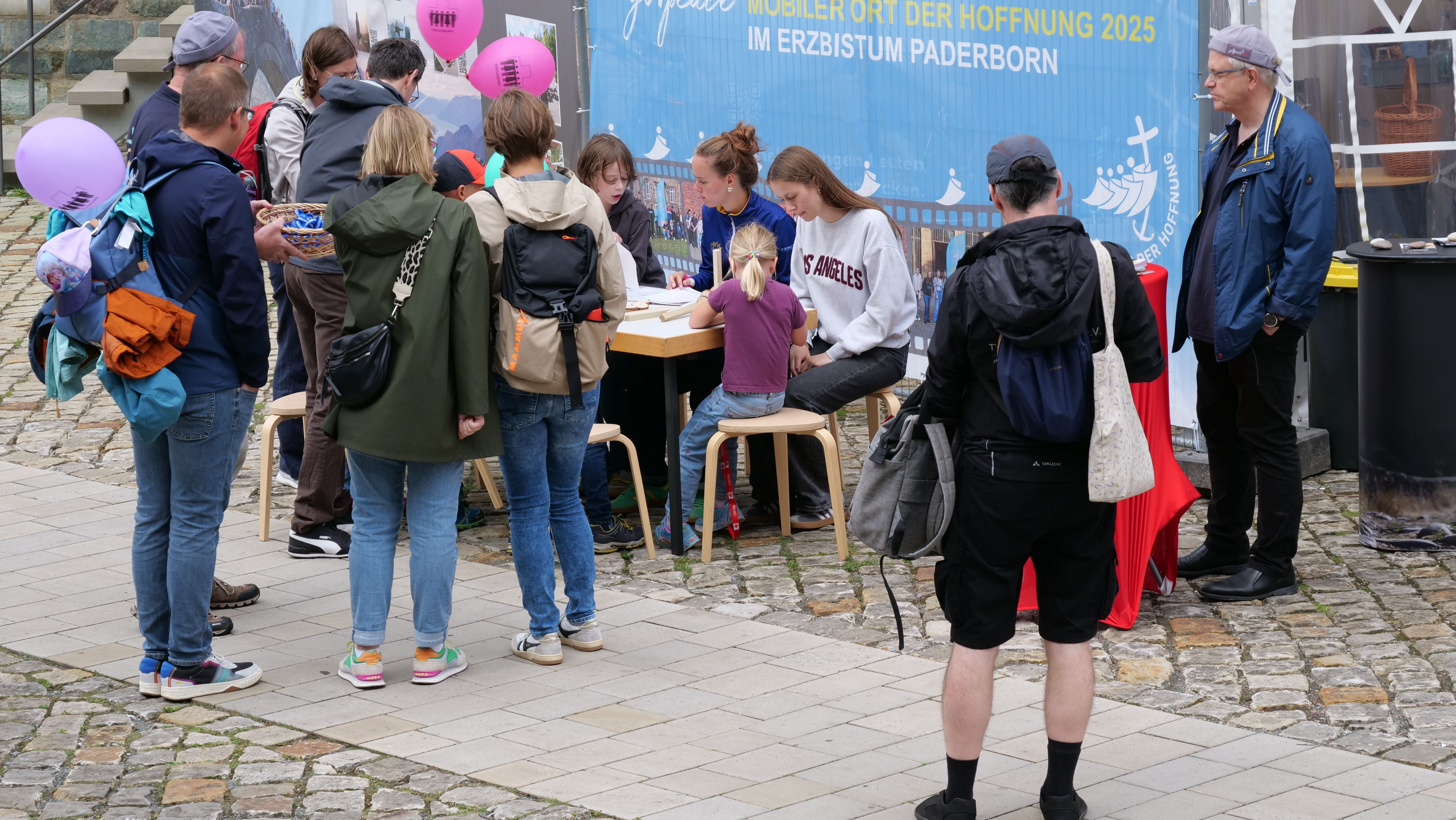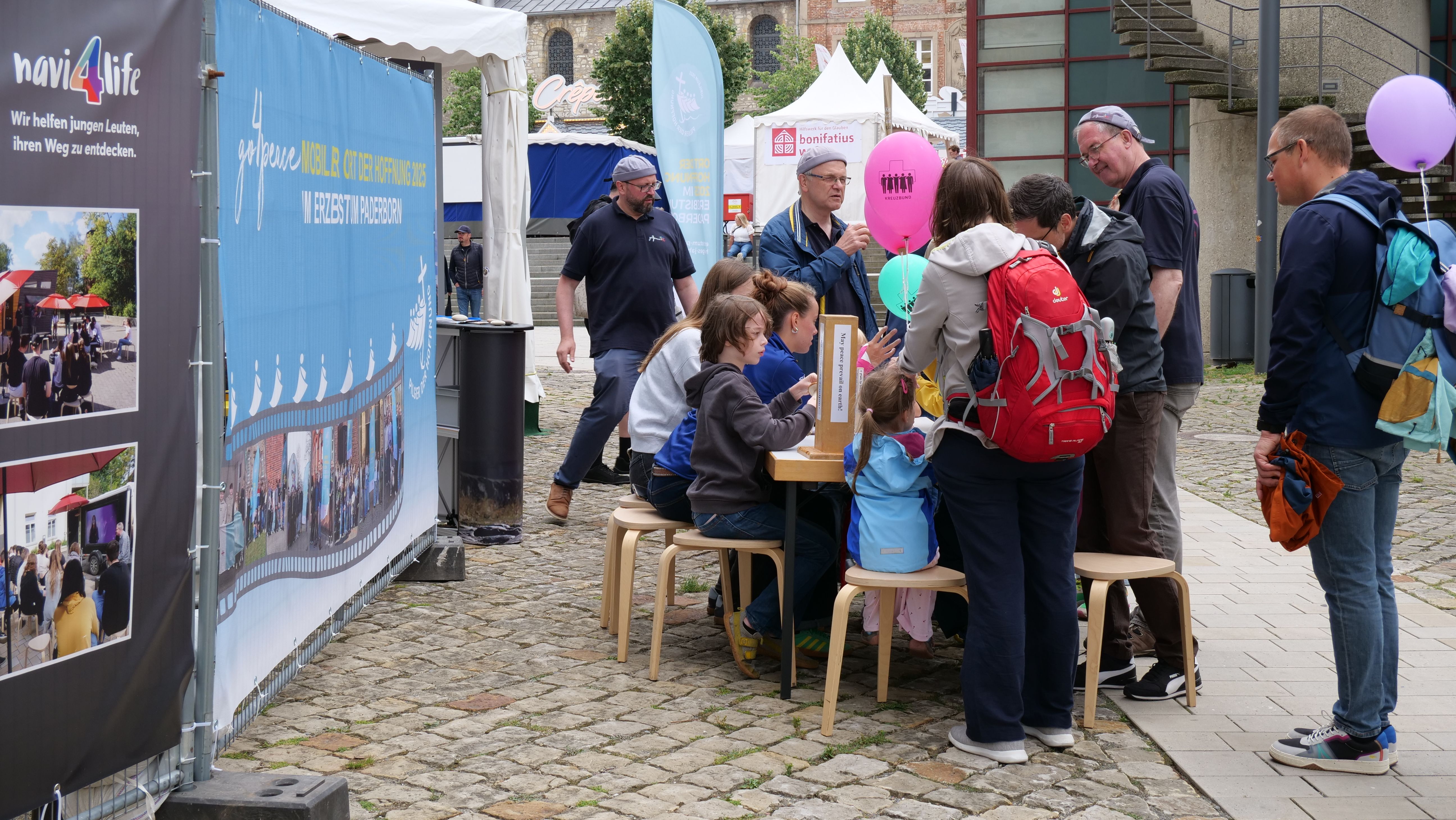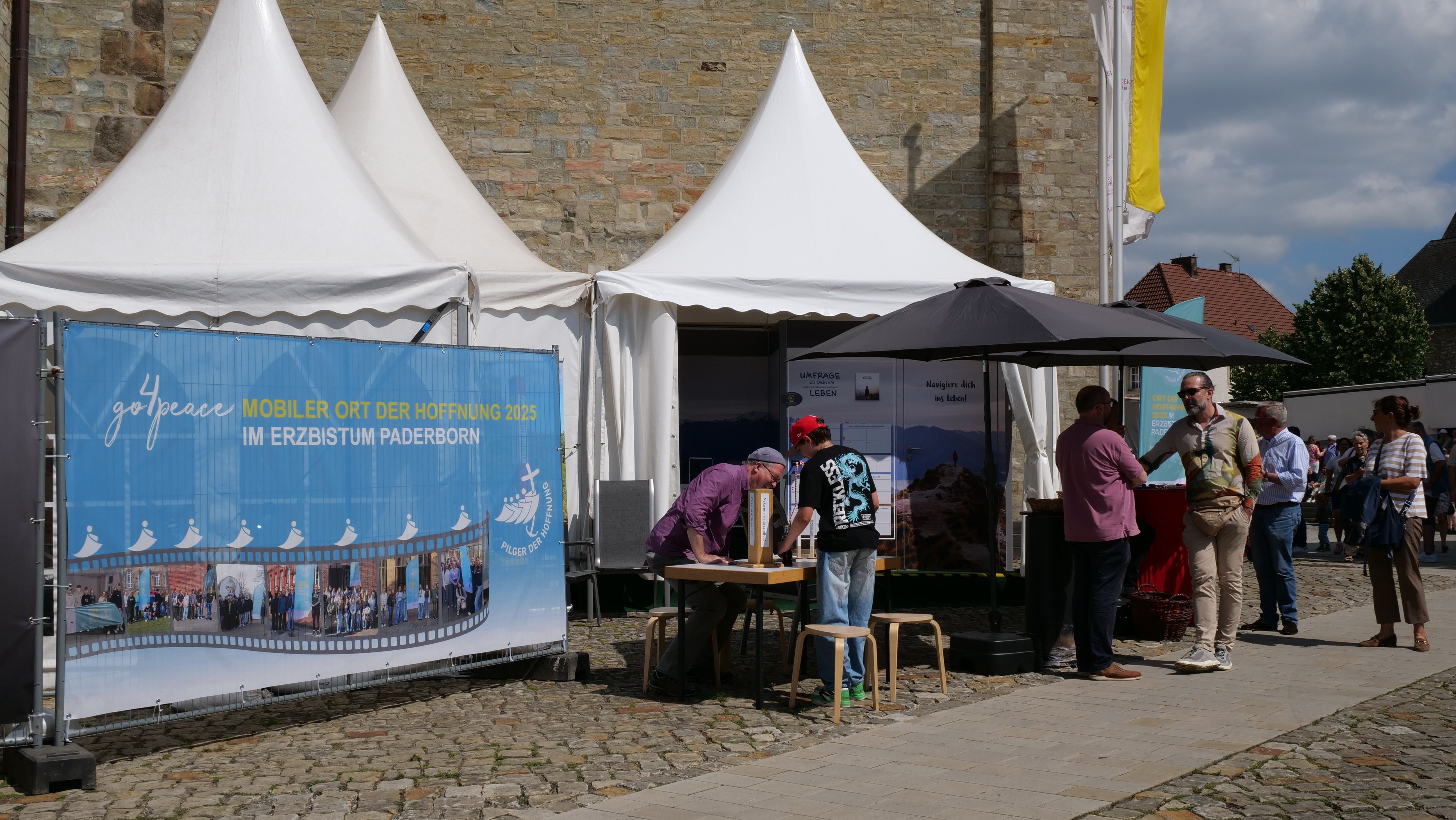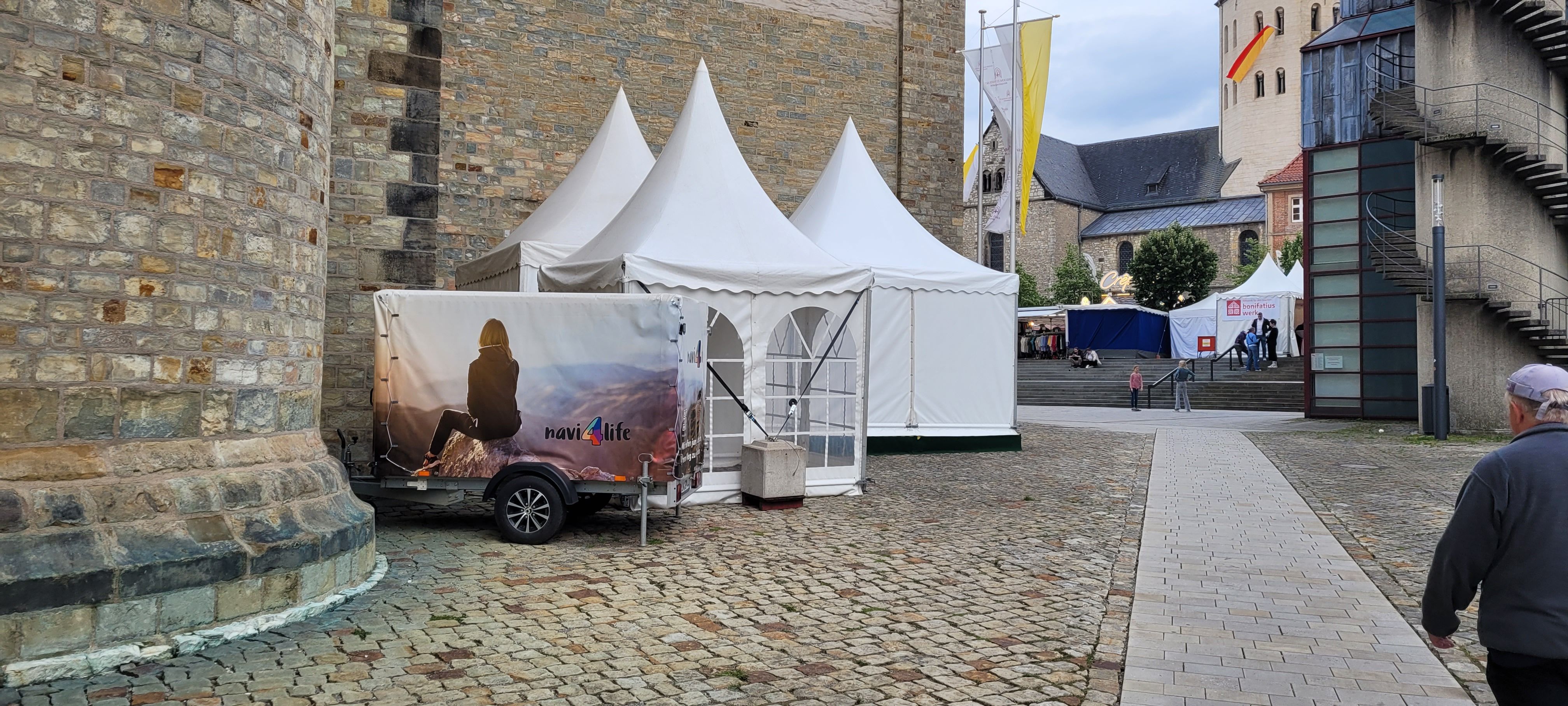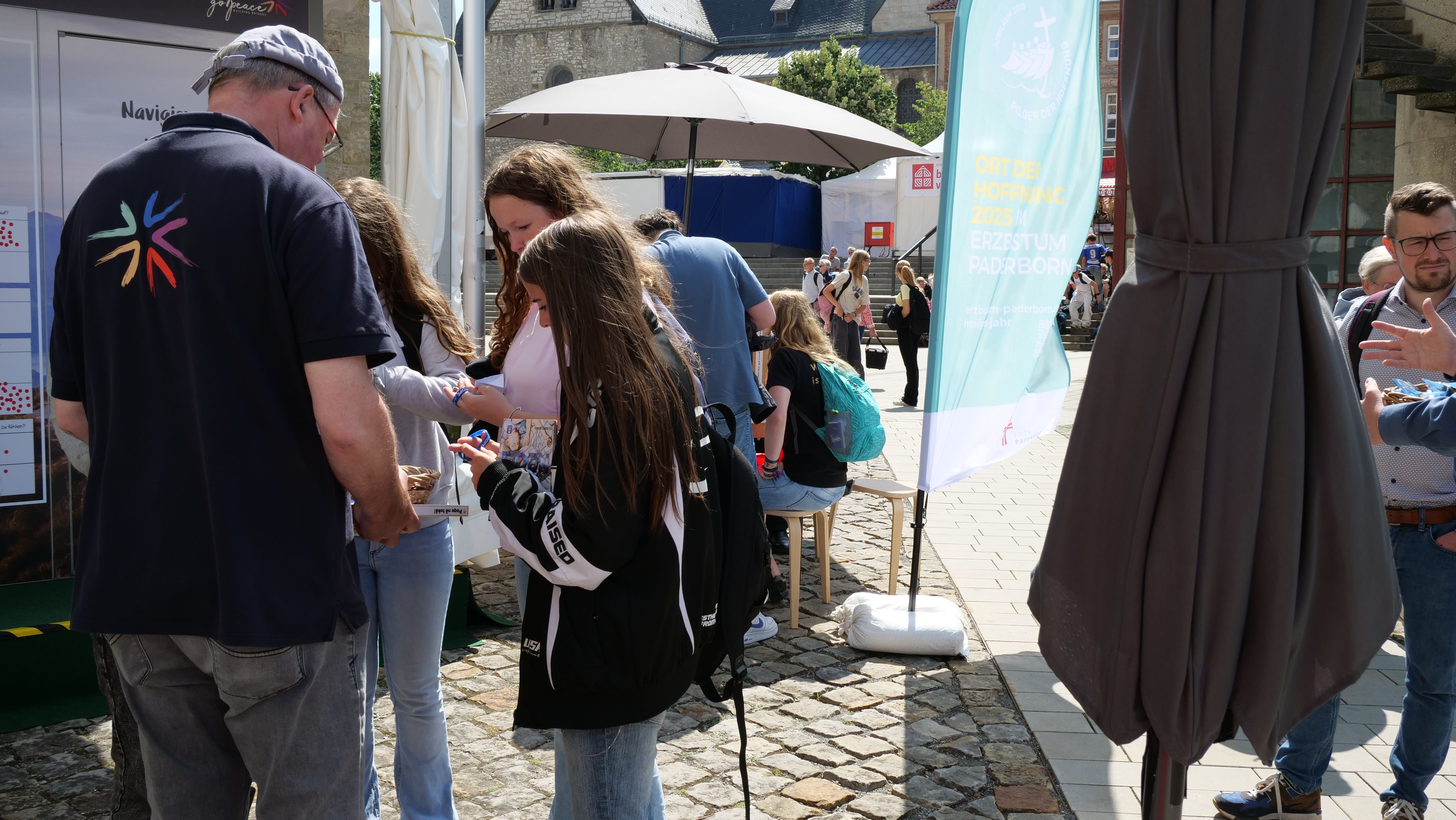 We were at the Cathedral Tower in Paderborn during the Libori festival (July 26 – August 3, 2025) with the experience course “navi4life – Navigate Yourself into Life!”. Archbishop Dr. Udo Markus Bentz smiled and said: “You are really standing in the wind here!” Yes, it is the windiest corner of the Cathedral – and many Libori pilgrims were “blown” past us. More than 180 young people, adults, and also children already walked the 10-minute course and were excited. A young woman said: “I found my way! – You really encouraged me. Keep going!” A priest added: “This is not only for young people – I also got new ideas for my life.” A superintendent said after walking through the four rooms with his wife: “You created a place here at the Libori festival where people can think about their own life. Impressive. Thank you!”