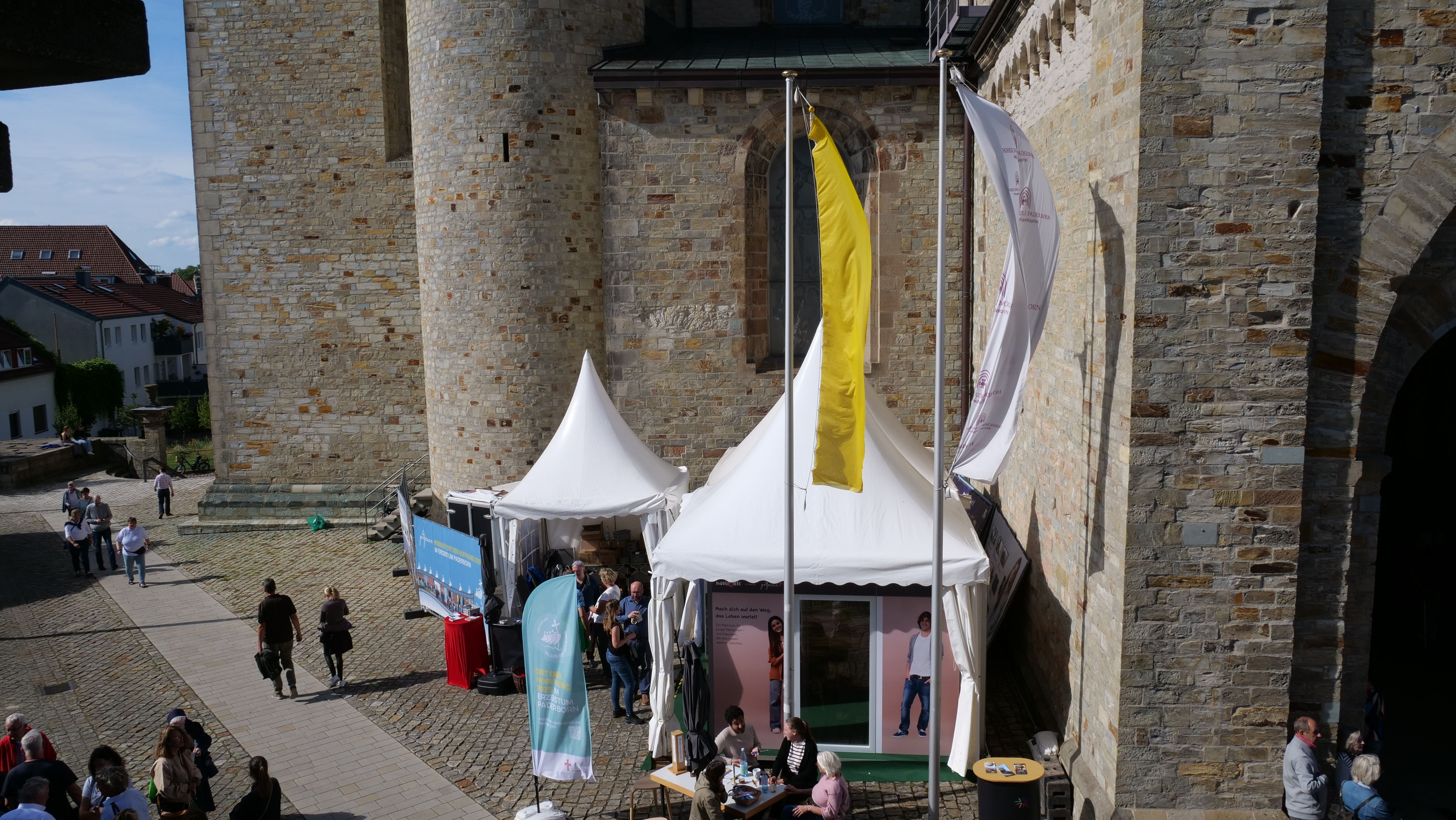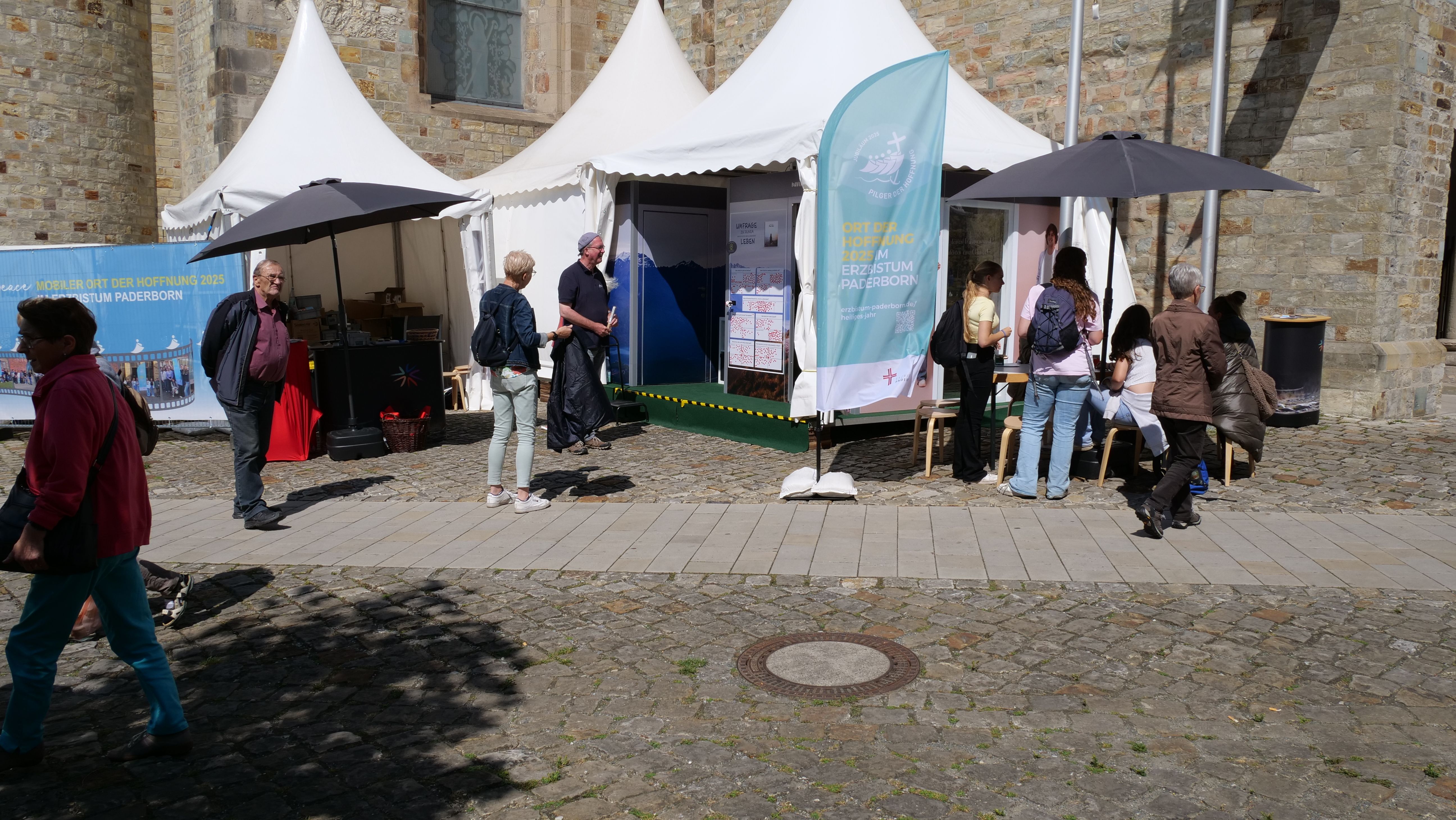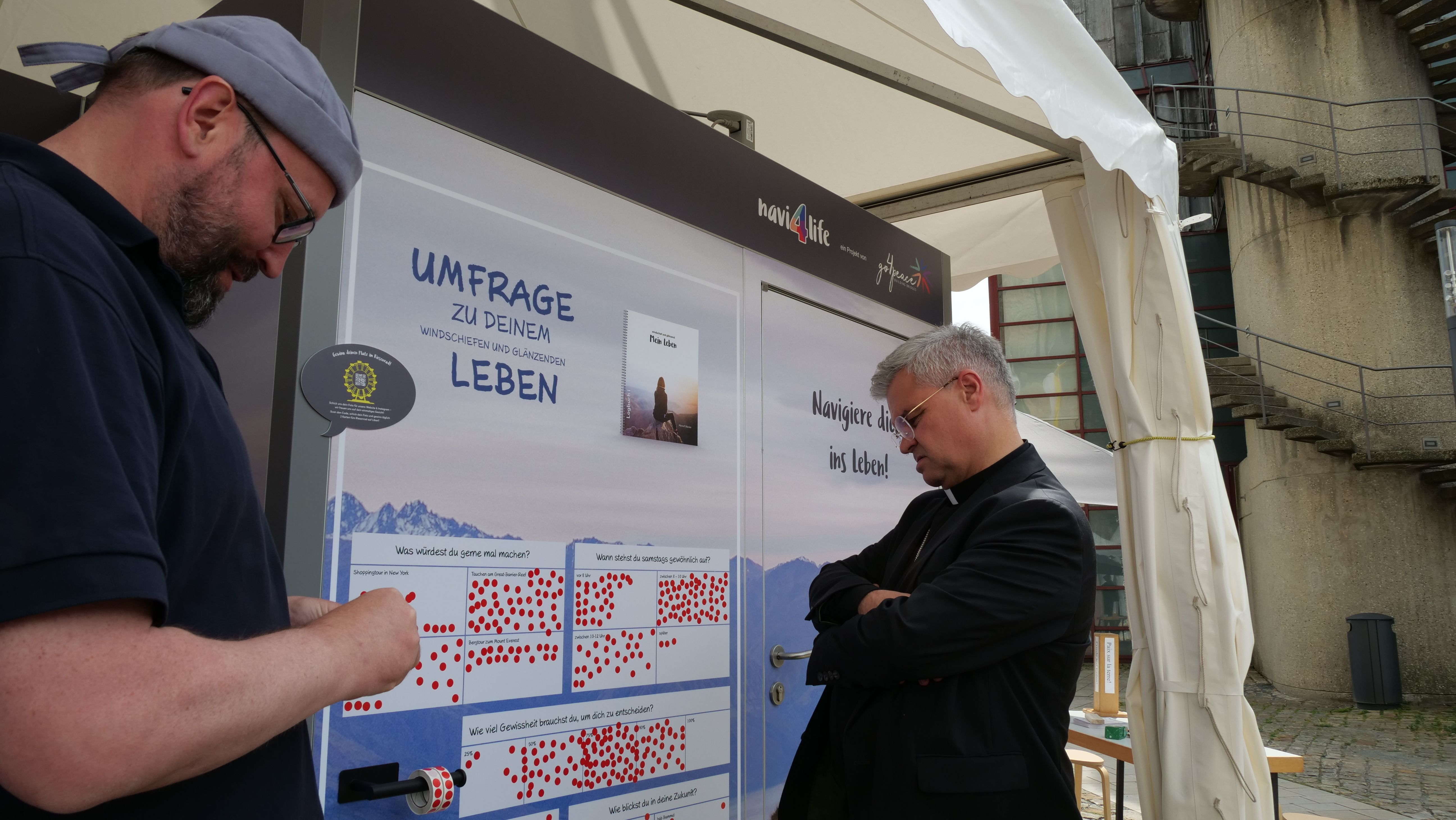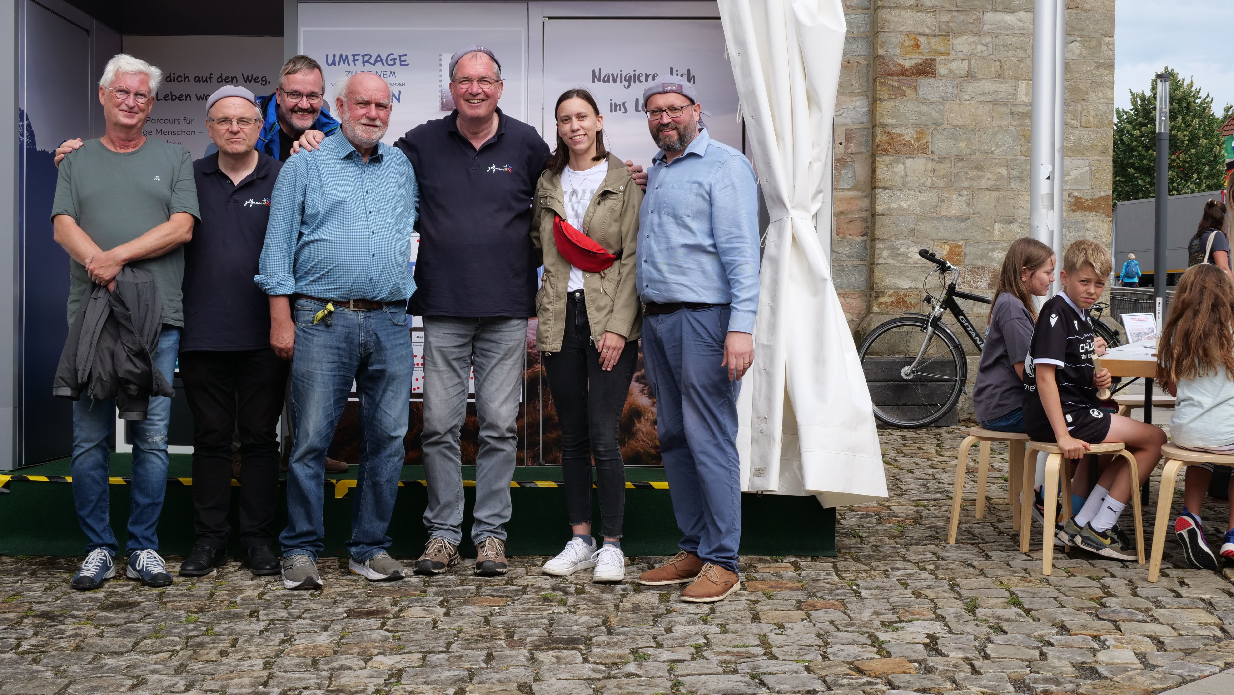 We were at the Cathedral Tower in Paderborn during the Libori festival (July 26 – August 3, 2025) with the experience course “navi4life – Navigate Yourself into Life!”. Archbishop Dr. Udo Markus Bentz smiled and said: “You are really standing in the wind here!” Yes, it is the windiest corner of the Cathedral – and many Libori pilgrims were “blown” past us. More than 180 young people, adults, and also children already walked the 10-minute course and were excited. A young woman said: “I found my way! – You really encouraged me. Keep going!” A priest added: “This is not only for young people – I also got new ideas for my life.” A superintendent said after walking through the four rooms with his wife: “You created a place here at the Libori festival where people can think about their own life. Impressive. Thank you!”