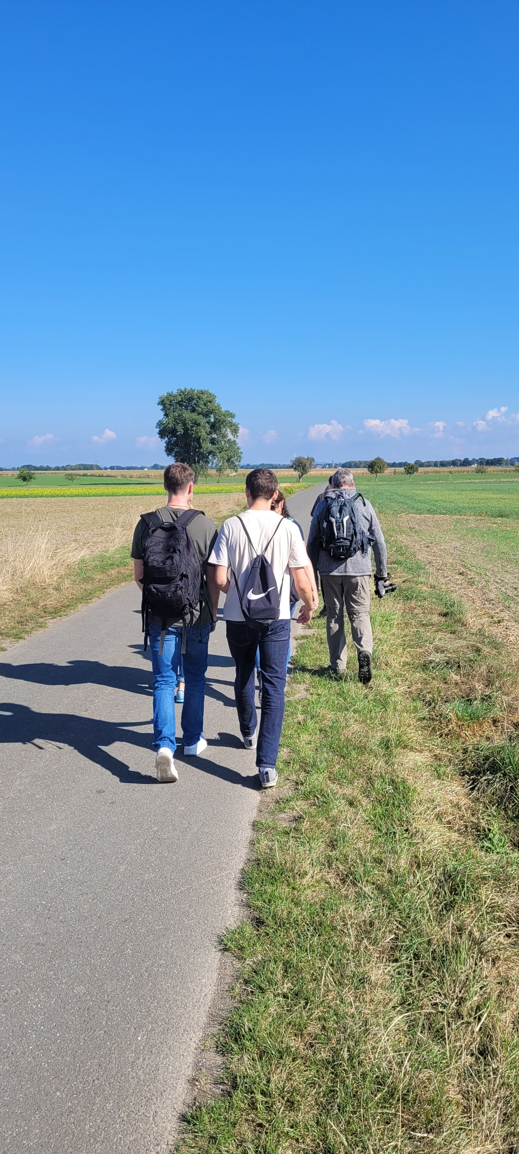Zu zehnt hatten wir uns auf den zweiten Pilgerweg der Hoffnung im Heiligen Jahr 2025 gemacht. Wir trafen uns am Bahnhof in Salzkotten und machten uns mit kleinen Impulsen zur Schöpfung auf den Weg zum Vaußhof in Scharmede. Es war ein Geschenk, bei strahlendem Sonnenschein durch die Schönheit und Weite der Natur laufen zu können und dabei im lebendigen Austausch zu sein. Auf dem Vaußhof angekommen, empfingen uns Anja und Marius mit einigen ihrer Kinder mit einer leckeren Gulasch- und Kürbissuppe. Schnell waren wir im lebendigen Austausch über nachhaltiges Leben, Wirtschaften und Arbeiten. Der Ort, an dem wir aßen, eine alte Deele mit einem beeindruckenden Pflasterboden aus Fischgrätenmuster – Handarbeit – uralt. Hier begegneten sich Vergangenheit, Gegenwart und – im bewussten Umgang mit den Gaben der Schöpfung – Zukunft. Nach dem Mittagessen ein Gang durchs gut sortierte Hof-Café und dann ging’s aufs Feld, wo wir beim Kartoffellesen halfen. Die sauberen Kartoffeln aus dem Trockenen, sandigen Boden „ernten“ zu dürfen, ein echtes Glücksgefühl. Danach ging Marius mit uns durch die Weite des Geländes, erzählte von der Geschichte des Hofes und von der SoLawi Vaußhof e.G., einer eingetragenen Solidarischen Genossenschaft. Als wir schließlich an einer großen Kuhweide standen, ließ uns Hedwig, eine Tochter von Marius und Anja wissen: „Und dort hinten, der schwarze Bulle, der heißt Klara und die Kuh daneben ist Hedwig, meine Lieblingskuh!“ Beeindruckt von all dem, was in den vergangenen zwei Jahrzehnten gewachsen war, kamen mir innere Bilder aus Vidovice ins Herz. Dort war Marius im Jahr 1996 mit uns im ersten Aufbaucamp gewesen und mit einer Träne im Auge teilte er mit uns: „Wisst ihr, dieses Camp damals, das war für mich ein Meilenstein im Leben. Irgendwie fehlte bei einem der vielen Bullis, mit denen wir nach Bosnien gefahren sind, ein zweiter Fahrer. Und dann sagte Meinolf zu mir: ‚Das kannst du doch machen - oder?‘ Dieser Augenblick, in dem mir so viel Vertrauen entgegen kam, hat etwas in mir geboren werden lassen, was ich zeitlebens nicht verloren habe: Mut.“